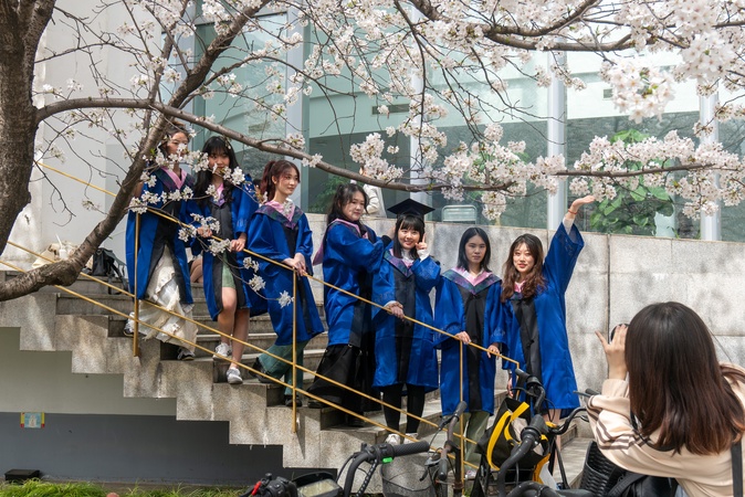 Senior students in the graduation gowns pose for photos on the campus of Tongji University in Shanghai, China Saturday, March 30, 2024., Credit:WANG GANG / Avalon