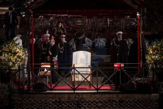 Pope Francis did not participate in the Good Friday procession to protect his health in view of his other commitments during Easter week. Via Crucis at the Colosseum in Rome during Holy Week of Easter on March 29, 2024 in Rome, Italy., Credit:Alessandro Serranv= / Avalon