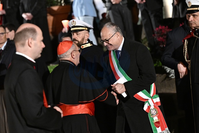 Pope Francis did not participate in the Good Friday procession to protect his health in view of his other commitments during Easter week. Via Crucis at the Colosseum in Rome during Holy Week of Easter. Cardinal Angelo De Donatis greets Mayor Roberto Gualtieri. March 29, 2024 in Rome, Italy., Credit:Maria Laura Antonelli / Avalon