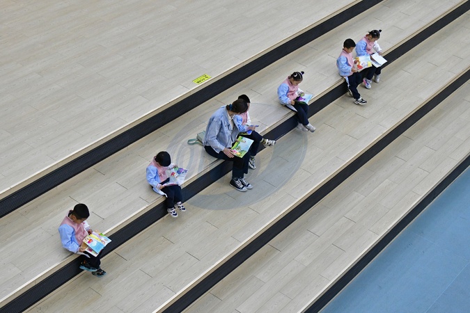 Children from a kindergarten read books in a public library in Yantai in east China's Shandong province Saturday, April 22, 2023., Credit:SUN WENTAN / Avalon