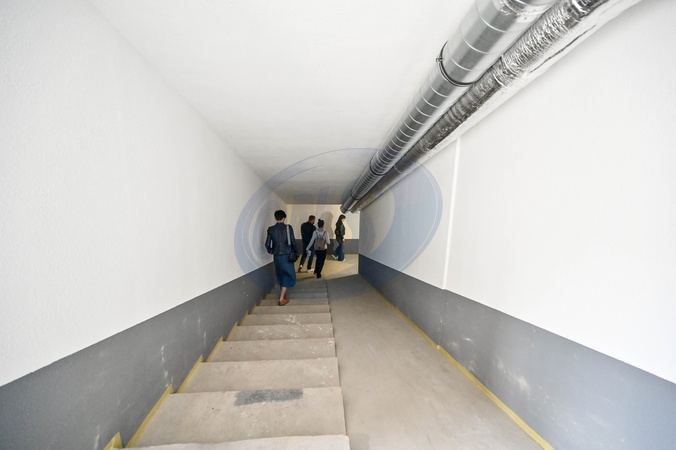 ZAPORIZHZHIA, UKRAINE - APRIL 1, 2024 - People go down the stairs into a new modular underground bomb shelter designed for 100 people that is being built in the yard of the five-storey residential building that was damaged by a Russian S-300 missile on October 6, 2022, and is now being restored, Zaporizhzhia, southeastern Ukraine., Credit:Dmytro Smolienko / Avalon