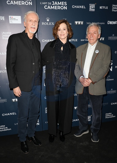 James Cameron, Sigourney Weaver et Costa-Gavras lors du Vernissage de l'exposition "L'Art de James Cameron" à La Cinémathèque française à Paris le 3 avril 2024 © Guirec Coadic / Bestimage Opening of "The Art of James Cameron" exhibition at La Cinémathèque française in Paris on april 3rd 2024