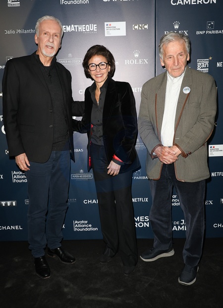 James Cameron, Rachida Dati, ministre de la Culture et Costa-Gavras lors du Vernissage de l'exposition "L'Art de James Cameron" à La Cinémathèque française à Paris le 3 avril 2024 © Guirec Coadic / Bestimage Opening of "The Art of James Cameron" exhibition at La Cinémathèque française in Paris on april 3rd 2024