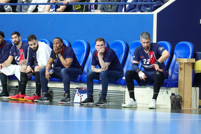 Patrice Annonay, assistant coach of Paris Saint-Germain Handball, Raul Gonzalez Gutierrez, head coach of Paris Saint-Germain Handball and Luka Karabatic of Paris Saint-Germain Handball - Paris Saint Germain remporte la victoire face à Orlen Wisla Plock en barrage retour de la Ligue des Champions (34-33) à Paris, le 4 avril 2024. © Kevin Domas / Panoramic / Bestimage Paris Saint Germain wins against Orlen Wisla Plock in the second leg of the Champions League (34-33) in Paris, April 4, 2024.