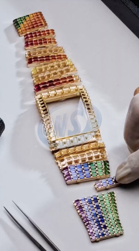 Pictures MUST credit: Jacob & Co Ultra high end jeweller Jacob and Co has unveiled three gem studded additions to its aptly named, top-of-the-range Billionaire III watch collection.. The three new timepieces are titled, Emeralds, Rubies, and Rainbow. Prices are only available on request but previous pieces in the range start at $3 million USD and gone up to $20 million. Leading the way is the Billionaire III Rainbow which features 580 natural sapphires in 30 different colours to achieve a rainbow effect on watch and strap. They are set in rose gold. Additionally, 133 baguette-cut, unheated rubies are set around and on the movement. Finally there is one large, 1.01 ct. rose-cut diamond for the crown. The Billionaire III Emeralds is set with 714 of the natural green stones weighing a total of 102.35 carats. The number of red gems in the Billionaire III Rubies is also 714 while they tip the scales at 147.65 carats. Picture supplied by JLPPA © JLPPA/Bestimage