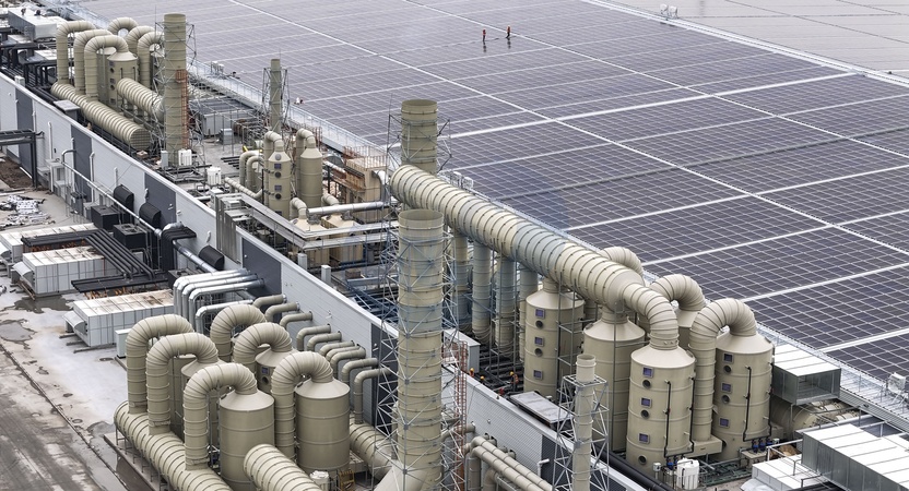 Workers check the solar panels on the roof of a plant of Trina Solar, a major Chinese player in the industry, in Huai'an city in east China's Jiangsu province Monday, March 18, 2024., Credit:KARRY ZHAO / Avalon