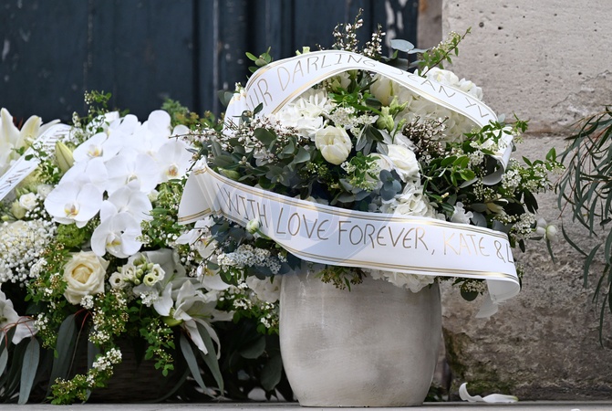 Bouquet de fleurs de Kate Moss - Arrivées aux obsèques de Jean-Yves Le Fur en l'église Saint-Roch à Paris, le 6 avril 2024. The funeral of Jean-Yves Le Fur at the Saint-Roch church in Paris, April 6, 2024.