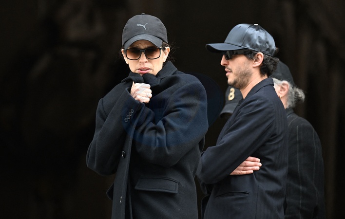Maïwenn et son fils Diego Le Fur - Arrivées aux obsèques de Jean-Yves Le Fur en l'église Saint-Roch à Paris, le 6 avril 2024. The funeral of Jean-Yves Le Fur at the Saint-Roch church in Paris, April 6, 2024.
