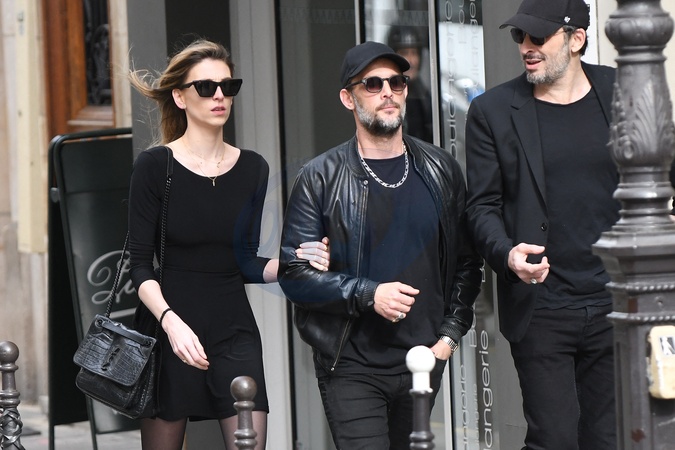 Nicolas Duvauchelle et sa compagne Chloé Roy, Michaël Cohen - Arrivées aux obsèques de Jean-Yves Le Fur en l'église Saint-Roch à Paris, le 6 avril 2024. The funeral of Jean-Yves Le Fur at the Saint-Roch church in Paris, April 6, 2024.