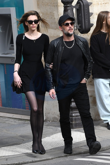 Nicolas Duvauchelle et sa compagne Chloé Roy - Arrivées aux obsèques de Jean-Yves Le Fur en l'église Saint-Roch à Paris, le 6 avril 2024. The funeral of Jean-Yves Le Fur at the Saint-Roch church in Paris, April 6, 2024.