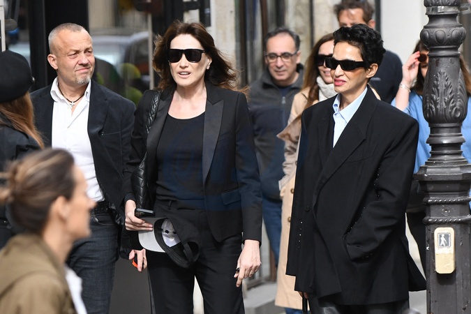 Carla Bruni et Farida Khelfa - Arrivées aux obsèques de Jean-Yves Le Fur en l'église Saint-Roch à Paris, le 6 avril 2024. The funeral of Jean-Yves Le Fur at the Saint-Roch church in Paris, April 6, 2024.