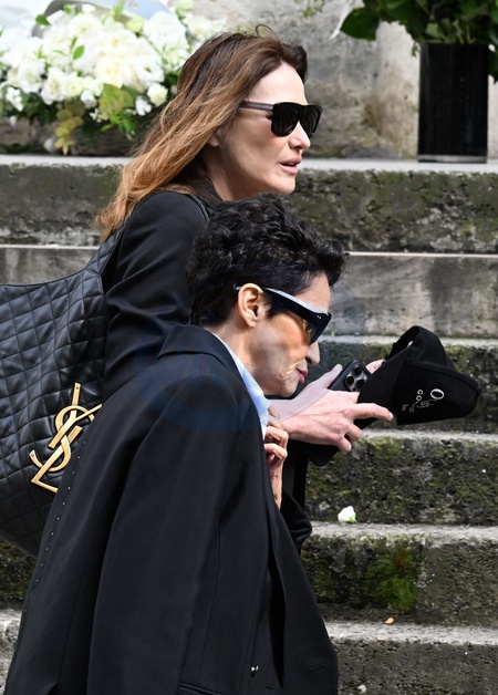 Farida Khelfa et Carla Bruni - Arrivées aux obsèques de Jean-Yves Le Fur en l'église Saint-Roch à Paris, le 6 avril 2024. The funeral of Jean-Yves Le Fur at the Saint-Roch church in Paris, April 6, 2024.