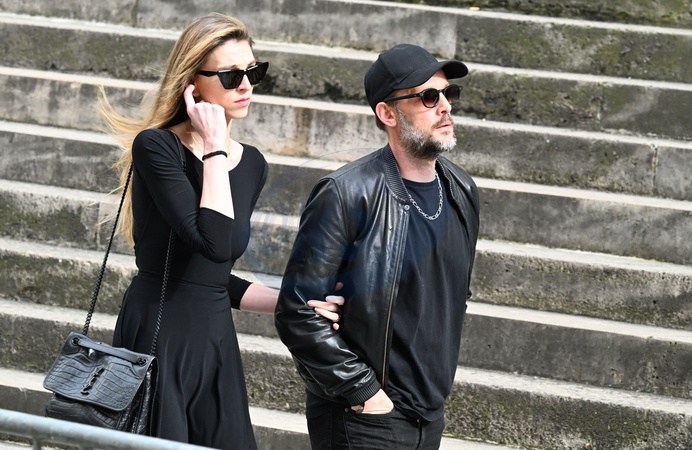 Nicolas Duvauchelle et sa compagne Chloé Roy - Arrivées aux obsèques de Jean-Yves Le Fur en l'église Saint-Roch à Paris, le 6 avril 2024. The funeral of Jean-Yves Le Fur at the Saint-Roch church in Paris, April 6, 2024.