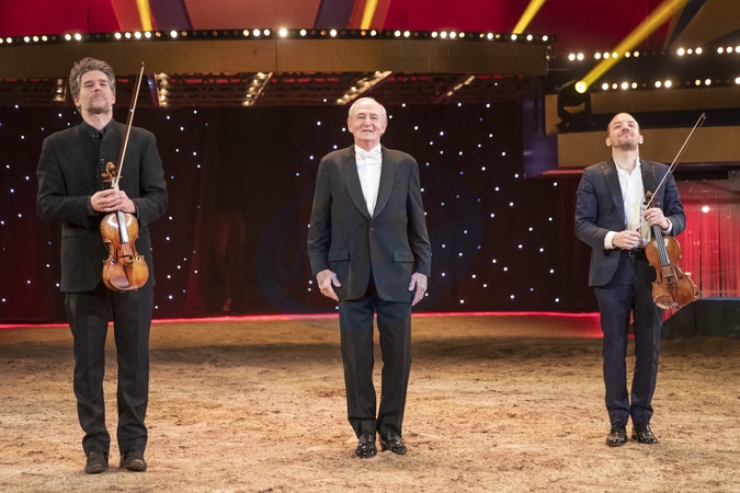 Exclusif - Prix Spécial - Alexis Gruss, mai&x302;tre écuyer Compagnie Gruss, Hugues Borsarello, violon et Nicolas Dautricourt, violon, (DVORAK &x2013; Humoresque « Dressage » avec 1 cheval) - Enregistrement de l'émission "Symphonie pour la vie, Spéciale Pièces Jaunes" aux Folies Grüss à Paris, diffusée le 4 février sur France 3. Le 12 janvier 2022 © Cyril Moreau / Bestimage Dans le cadre magique des Folies Gruss, les artistes se sont réunis pour offrir aux téléspectateurs un gala exceptionnel en soutien à la Fondation des Hôpitaux et à l'opération Pièces jaunes. C'est un spectacle unique que vous allez découvrir, présenté par F.Bollaert et G.Capuçon ! En effet, pour cette édition de Symphonie pour la vie, l'art équestre et la voltige s'ajoutent à la musique avec l'Orchestre Lamoureux, dirigé par 4 chefs de renommée internationale, et les plus grands noms du classique et de la variété. Symphonie pour la vie, c'est à l'origine une bande d'amis, des artistes classiques, qui se sont réunis pour enregistrer un disque au profit des soignants pendant le premier confinement au printemps 2020. Cette initiative a immédiatement été soutenue par France Télévisions avec une soirée spéciale enregistrée au Théâtre du Châtelet et diffusée en prime time sur France 3. Dans ce bel élan, 2021 a connu la seconde édition de ce projet à l'Opéra-Comique et en 2022, pour la troisième année consécutive. Symphonie pour la vie s'associe à la Fondation des hôpitaux, présidée par Brigitte Macron, et les artistes à l'origine du projet sont rejoints par de nouveaux venus qui s'impliquent tous avec l'envie de soutenir cette initiative ! Ils évolueront sur la piste des Folies Gruss, accueillis par les artistes de la Compagnie Alexis Gruss dont les numéros ponctueront la soirée. La Compagnie Gruss est une merveilleuse histoire de famille de trois générations d'artistes équestres, aériens et musiciens, à jamais saltimbanques et résolument tournés vers l'avenir. Et bien sûr, toute la soirée, des appels aux dons seront lancés par les artistes : les contributions de chacun permettant de changer le quotidien des enfants hospitalisés et de leurs familles. L'opération Pièces jaunes existe depuis plus de 30 ans maintenant, elle est à nouveau parrainée cette année par D.Deschamps. Depuis plus de 30 ans, l'opération Pièces Jaunes est le grand rendez-vous de la générosité de début d'année avec sa collecte emblématique et sa tirelire. Pour améliorer la vie quotidienne des enfants, des adolescents et des jeunes adultes hospitalisés, la Fondation des Hôpitaux, à travers l'opération Pièces jaunes, subventionne chaque année de nombreux projets dans les hôpitaux publics français. Depuis 1989, plus de 9 100 projets ont été financés sur tout le territoire : 90 maisons des ados, 2 900 chambres parents-enfants, 421 espaces de jeux, mais également des maisons des familles, des séjours thérapeutiques. Exclusive - For Germany Call For Price - No Web pour la Belgique et la Suisse - Celebs attending the special yellow pieces (Pièces Jaunes) at the Folies Gruss Symphonie Pour La Vie event, in Paris, France. On January 12, 2022.