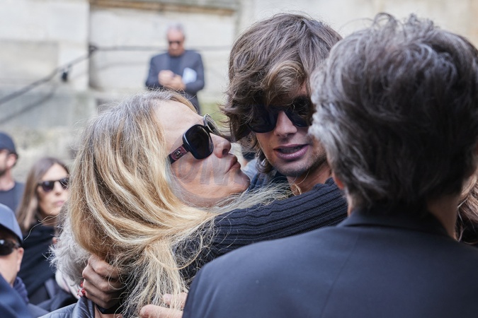 Karen Mulder, Diego Le Fur - Sortie des obsèques de Jean-Yves Le Fur en l'église Saint-Roch à Paris, le 6 avril 2024. © Cyril Moreau-Dominique Jacovides/Bestimage Funeral ceremony for French businessman Jean-Yves Le Fur at Saint Roch Church in Paris, France on April 6, 2024. Jean-Yves Le Fur was a businessman invested in the world of media, died at the age of 59 due to pancreatic cancer. He was former fiance of Princess Stephanie of Monaco and has a son, Diego with French actress and director Maiwenn, and was K.Moss's godfather at her wedding to J.Hince.