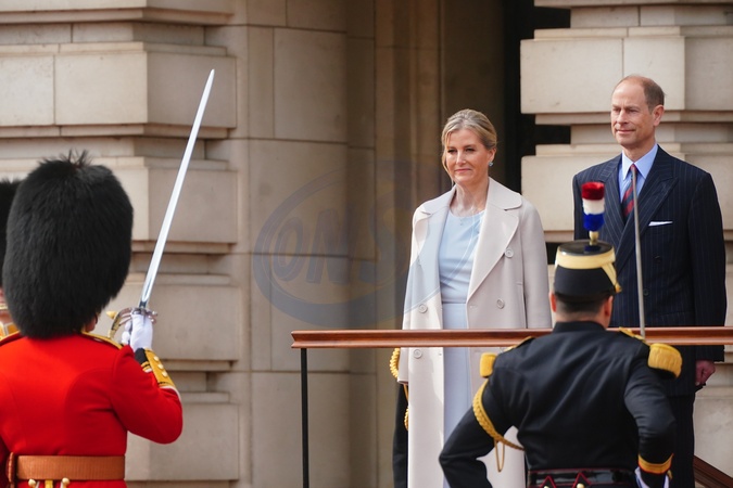 The Duke and Duchess of Edinburgh, on behalf of King Charles III, watch the Changing of the Guard at Buckingham Palace, London, with France's Gendarmerie's Garde Republicaine taking part to commemorate the 120th anniversary of the Entente Cordiale - the historic diplomatic agreement between Britain and France which laid the groundwork for their collaboration in both world wars. France is the first non-Commonwealth country to take part in the Changing of the Guard ceremony at Buckingham Palace., Credit:Victoria Jones / Avalon