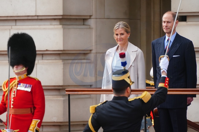 The Duke and Duchess of Edinburgh, on behalf of King Charles III, at the Changing of the Guard at Buckingham Palace, London, with France's Gendarmerie's Garde Republicaine taking part to commemorate the 120th anniversary of the Entente Cordiale - the historic diplomatic agreement between Britain and France which laid the groundwork for their collaboration in both world wars. France is the first non-Commonwealth country to take part in the Changing of the Guard ceremony at Buckingham Palace., Credit:Victoria Jones / Avalon