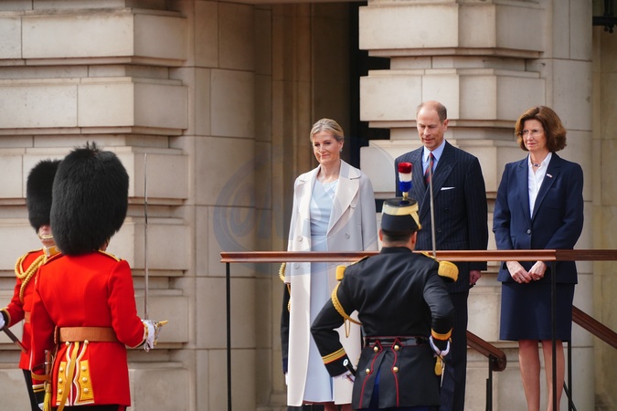 The Duke and Duchess of Edinburgh, on behalf of King Charles III, with French Ambassador to the UK, Helene Duchene, at the Changing of the Guard at Buckingham Palace, London, with France's Gendarmerie's Garde Republicaine taking part to commemorate the 120th anniversary of the Entente Cordiale - the historic diplomatic agreement between Britain and France which laid the groundwork for their collaboration in both world wars. France is the first non-Commonwealth country to take part in the Changing of the Guard ceremony at Buckingham Palace., Credit:Victoria Jones / Avalon