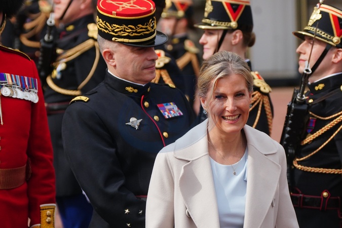 The Duchess of Edinburgh, on behalf of King Charles III, at the Changing of the Guard at Buckingham Palace, London, with France's Gendarmerie's Garde Republicaine taking part to commemorate the 120th anniversary of the Entente Cordiale - the historic diplomatic agreement between Britain and France which laid the groundwork for their collaboration in both world wars. France is the first non-Commonwealth country to take part in the Changing of the Guard ceremony at Buckingham Palace., Credit:Victoria Jones / Avalon
