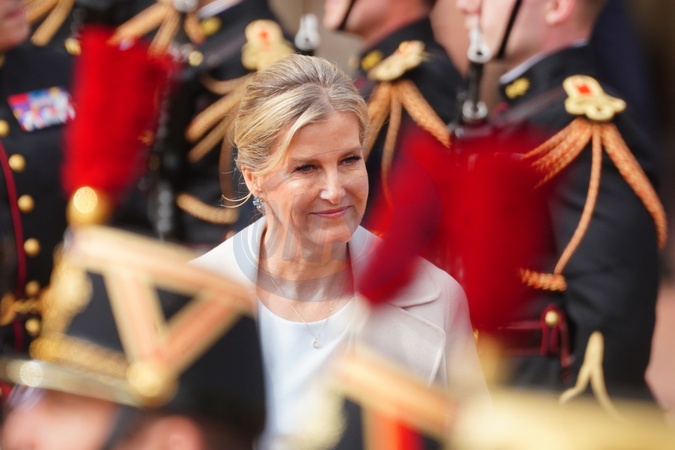 The Duchess of Edinburgh, on behalf of King Charles III, at the Changing of the Guard at Buckingham Palace, London, with France's Gendarmerie's Garde Republicaine taking part to commemorate the 120th anniversary of the Entente Cordiale - the historic diplomatic agreement between Britain and France which laid the groundwork for their collaboration in both world wars. France is the first non-Commonwealth country to take part in the Changing of the Guard ceremony at Buckingham Palace., Credit:Victoria Jones / Avalon