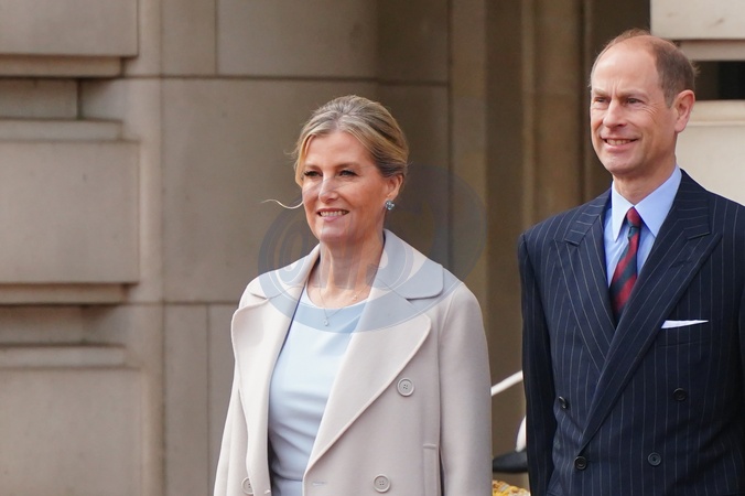 The Duke and Duchess of Edinburgh, on behalf of King Charles III, watching the Changing of the Guard at Buckingham Palace, London, with France's Gendarmerie's Garde Republicaine taking part to commemorate the 120th anniversary of the Entente Cordiale - the historic diplomatic agreement between Britain and France which laid the groundwork for their collaboration in both world wars. France is the first non-Commonwealth country to take part in the Changing of the Guard ceremony at Buckingham Palace., Credit:Victoria Jones / Avalon