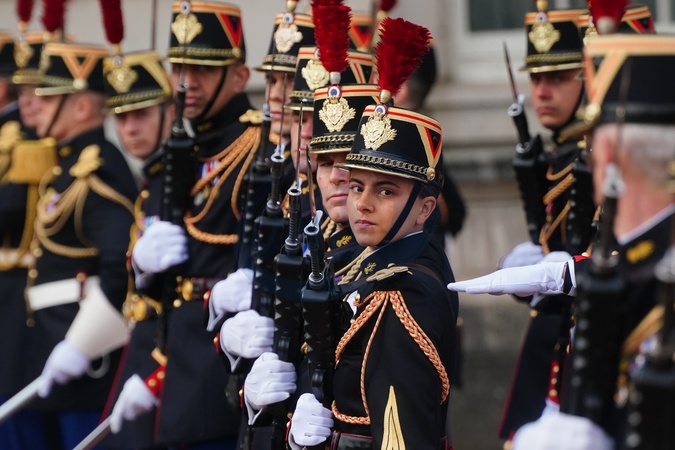 France's Gendarmerie's Garde Republicaine arrive at Buckingham Palace, London, during the Changing of the Guard ceremony, to commemorate the 120th anniversary of the Entente Cordiale - the historic diplomatic agreement between Britain and France which laid the groundwork for their collaboration in both world wars. France is the first non-Commonwealth country to take part in the Changing of the Guard., Credit:Victoria Jones / Avalon