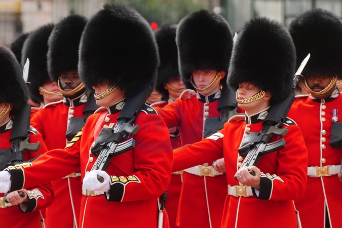 Guardsmen from the Scots Guards during the Changing of the Guard at Buckingham Palace, London, with France's Gendarmerie's Garde Republicaine taking part to commemorate the 120th anniversary of the Entente Cordiale - the historic diplomatic agreement between Britain and France which laid the groundwork for their collaboration in both world wars. France is the first non-Commonwealth country to take part in the Changing of the Guard ceremony at Buckingham Palace., Credit:Victoria Jones / Avalon