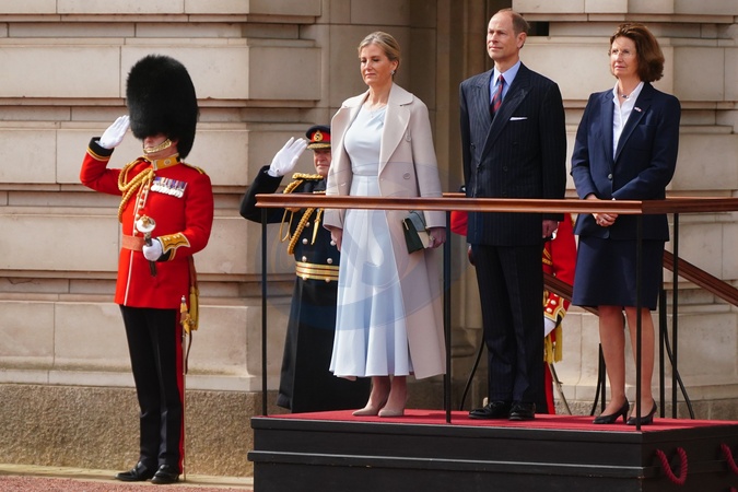 The Duke and Duchess of Edinburgh, on behalf of King Charles III, with French Ambassador to the UK, Helene Duchene, at the Changing of the Guard at Buckingham Palace, London, with France's Gendarmerie's Garde Republicaine taking part to commemorate the 120th anniversary of the Entente Cordiale - the historic diplomatic agreement between Britain and France which laid the groundwork for their collaboration in both world wars. France is the first non-Commonwealth country to take part in the Changing of the Guard ceremony at Buckingham Palace., Credit:Victoria Jones / Avalon