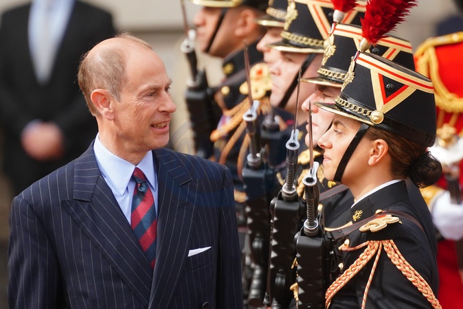 The Duke of Edinburgh, on behalf of King Charles III, at the Changing of the Guard at Buckingham Palace, London, with France's Gendarmerie's Garde Republicaine taking part to commemorate the 120th anniversary of the Entente Cordiale - the historic diplomatic agreement between Britain and France which laid the groundwork for their collaboration in both world wars. France is the first non-Commonwealth country to take part in the Changing of the Guard ceremony at Buckingham Palace., Credit:Victoria Jones / Avalon