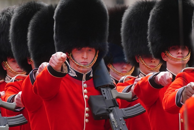 Guardsmen from the Scots Guards during the Changing of the Guard at Buckingham Palace, London, with France's Gendarmerie's Garde Republicaine taking part to commemorate the 120th anniversary of the Entente Cordiale - the historic diplomatic agreement between Britain and France which laid the groundwork for their collaboration in both world wars. France is the first non-Commonwealth country to take part in the Changing of the Guard ceremony at Buckingham Palace., Credit:Victoria Jones / Avalon