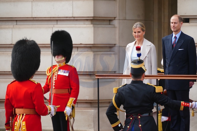 The Duke and Duchess of Edinburgh, on behalf of King Charles III, at the Changing of the Guard at Buckingham Palace, London, with France's Gendarmerie's Garde Republicaine taking part to commemorate the 120th anniversary of the Entente Cordiale - the historic diplomatic agreement between Britain and France which laid the groundwork for their collaboration in both world wars. France is the first non-Commonwealth country to take part in the Changing of the Guard ceremony at Buckingham Palace., Credit:Victoria Jones / Avalon
