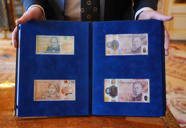 Banknoty z wizerunkiem króla Karola III, które wejdą do obiegu 5 czerwca, przedstawione królowi przez gubernatora Banku Anglii Andrew Baileya w pałacu Buckingham w Londynie.