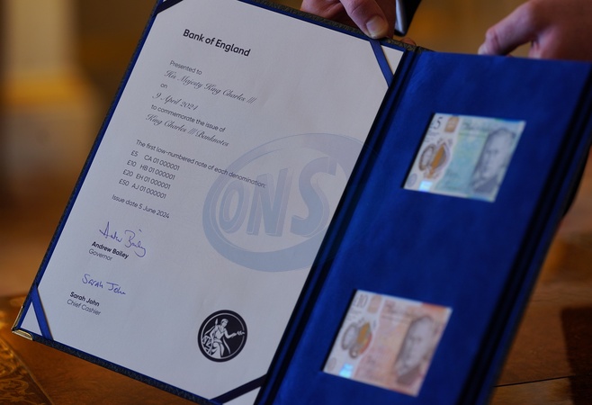 Banknoty z wizerunkiem króla Karola III, które wejdą do obiegu 5 czerwca, przedstawione królowi przez gubernatora Banku Anglii Andrew Baileya w pałacu Buckingham w Londynie.