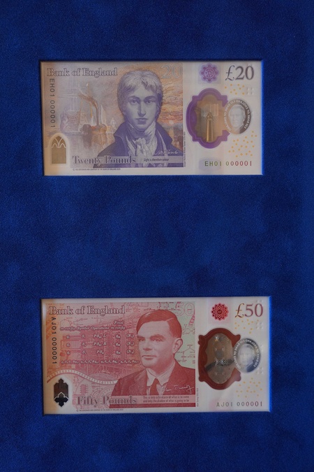 Banknoty z wizerunkiem króla Karola III, które wejdą do obiegu 5 czerwca, przedstawione królowi przez gubernatora Banku Anglii Andrew Baileya w pałacu Buckingham w Londynie.