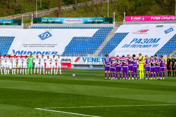 KYIV, UKRAINE - APRIL 8, 2024 - Players of FC Dynamo Kyiv (white kit) and FC LNZ Cherkasy (purple kit) are seen on the pitch before the Ukrainian Premier League Matchday 23 fixture at the Valeriy Lobanovskyi Dynamo Stadium, Kyiv, capital of Ukraine., Credit:Pavlo_Bagmut / Avalon