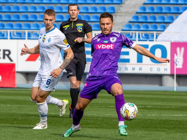 KYIV, UKRAINE - APRIL 8, 2024 - Midfielder Volodymyr Brazhko (L) of FC Dynamo Kyiv is seen in action with a player of FC LNZ Cherkasy during the Ukrainian Premier League Matchday 23 fixture at the Valeriy Lobanovskyi Dynamo Stadium, Kyiv, capital of Ukraine., Credit:Pavlo_Bagmut / Avalon