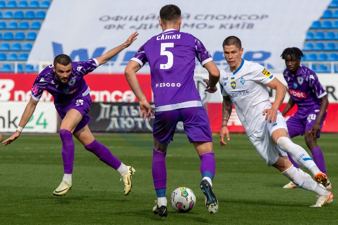 KYIV, UKRAINE - APRIL 8, 2024 - Defender Hajdin Salihu (C) of FC LNZ Cherkasy controls the ball during the Ukrainian Premier League Matchday 23 fixture against FC Dynamo Kyiv at the Valeriy Lobanovskyi Dynamo Stadium, Kyiv, capital of Ukraine., Credit:Pavlo_Bagmut / Avalon