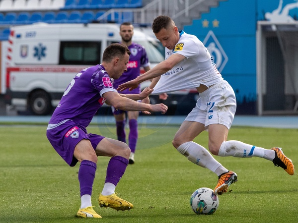 KYIV, UKRAINE - APRIL 8, 2024 - Players of FC Dynamo Kyiv (white kit) and FC LNZ Cherkasy (purple kit) are seen in action during the Ukrainian Premier League Matchday 23 fixture at the Valeriy Lobanovskyi Dynamo Stadium, Kyiv, capital of Ukraine., Credit:Pavlo_Bagmut / Avalon