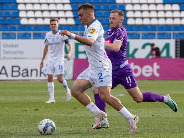 KYIV, UKRAINE - APRIL 8, 2024 - Midfielder Hennadii Pasich (R) of FC LNZ Cherkasy is seen in action with defender Kostiantyn Vivcharenko of FC Dynamo Kyiv during the Ukrainian Premier League Matchday 23 fixture at the Valeriy Lobanovskyi Dynamo Stadium, Kyiv, capital of Ukraine., Credit:Pavlo_Bagmut / Avalon