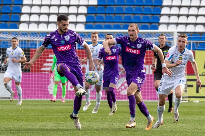 KYIV, UKRAINE - APRIL 8, 2024 - Players of FC Dynamo Kyiv (white kit) and FC LNZ Cherkasy (purple kit) are seen in action during the Ukrainian Premier League Matchday 23 fixture at the Valeriy Lobanovskyi Dynamo Stadium, Kyiv, capital of Ukraine., Credit:Pavlo_Bagmut / Avalon