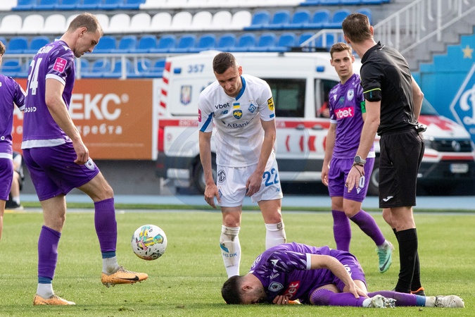 KYIV, UKRAINE - APRIL 8, 2024 - An injured player of FC LNZ Cherkasy lies on the pitch during the Ukrainian Premier League Matchday 23 fixture against FC Dynamo Kyiv at the Valeriy Lobanovskyi Dynamo Stadium, Kyiv, capital of Ukraine., Credit:Pavlo_Bagmut / Avalon
