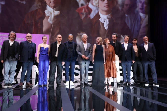 Marc Duret, Olivier Claverie, Lily Dupont, Xavier Brossard, Assaad Bouab, Michael Douglas, Ludivine Sagnier, Florence Darel, Daniel Mays, Thibault de Montalembert, Noah Jupe et Timothy Van Patten (casting de la série "Franklin") - Cérémonie de clôture de la saison 7 du festival "Canneseries" à Cannes, avant la projection de la série "Franklin". Le 10 avril 2024 © Denis Guignebourg / Bestimage Closing ceremony and global premiere of "Franklin" during CANNESERIES at Palais des Festivals in Cannes. On April 10, 2024