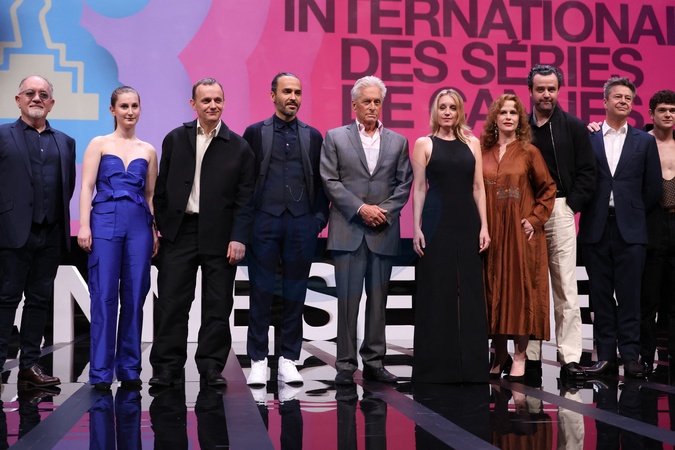 Olivier Claverie, Lily Dupont, Xavier Brossard, Assaad Bouab, Michael Douglas, Ludivine Sagnier, Florence Darel, Daniel Mays, Thibault de Montalembert, Noah Jupe (casting de la série "Franklin") - Cérémonie de clôture de la saison 7 du festival "Canneseries" à Cannes, avant la projection de la série "Franklin". Le 10 avril 2024 © Denis Guignebourg / Bestimage Closing ceremony and global premiere of "Franklin" during CANNESERIES at Palais des Festivals in Cannes. On April 10, 2024