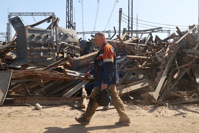 KHARKIV, UKRAINE - APRIL 10, 2024 - A utility worker walks past a pile of debris at an energy facility damaged by Russian shelling that is being repaired, Kharkiv, northeastern Ukraine., Credit:Vyacheslav Madiyevskyy / Avalon