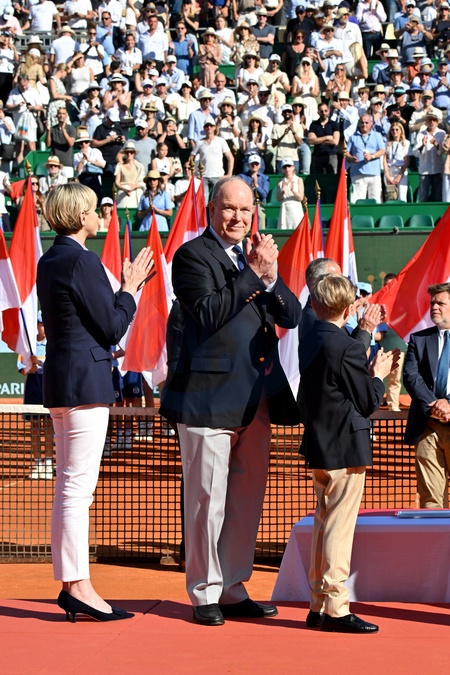 La princesse Charlene, le prince Albert II de Monaco lors de la remise de prix après la finale du tournoi de tennis Masters 1000 de Monte-Carlo à Roquebrune-Cap-Martin le 14 avril 2024. © Bruno Bebert / Bestimage Prize-giving ceremony after the final of the Monte-Carlo Masters 1000 tennis tournament in Roquebrune-Cap-Martin on 14 April 2024.