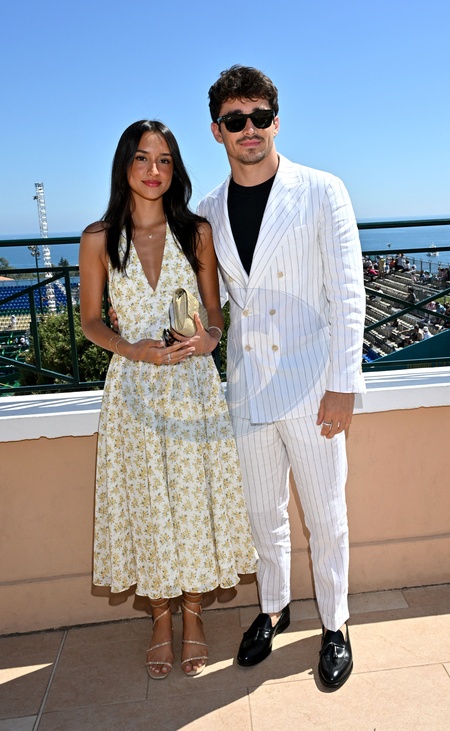 Le pilote monégasque de F1 Charles Leclerc et sa compagne Alexandra Saint Mleux lors de la finale du Rolex Masters 1000 de Monte-Carlo à Roquebrune-Cap-Martin le 14 avril 2024. © Bruno Bebert / Bestimage Celebs watch the final of the Monte Carlo Rolex Masters 1000 in Roquebrune-Cap-Martin on 14 April 2024.