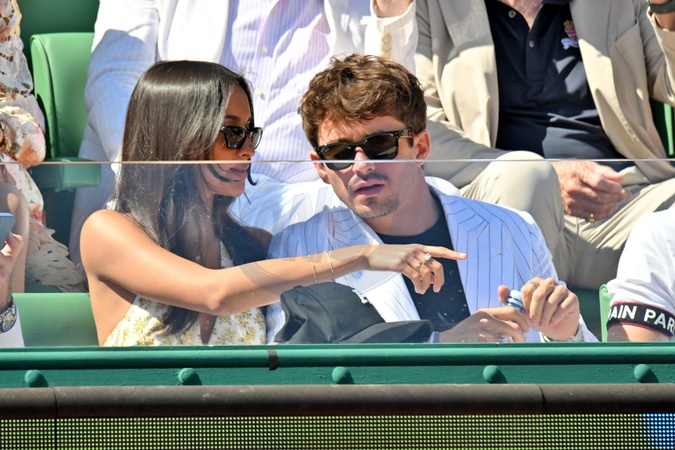 Le pilote monégasque de F1 Charles Leclerc et sa compagne Alexandra Saint Mleux lors de la finale du Rolex Masters 1000 de Monte-Carlo à Roquebrune-Cap-Martin le 14 avril 2024. © Bruno Bebert / Bestimage Celebs watch the final of the Monte Carlo Rolex Masters 1000 in Roquebrune-Cap-Martin on 14 April 2024.