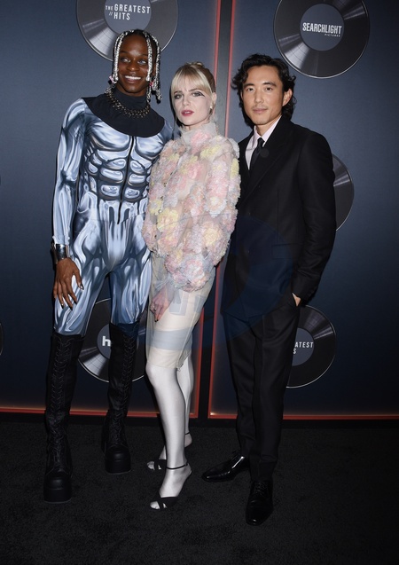 Austin Crute, Lucy Boynton and Justin H. Min arriving at Searchlight Pictures' "The Greatest Hits” Los Angeles Premiere held at the El Capitan Theatre in Los Angeles, CA on April 15, 2024. © Janet Gough / AFF-USA.COM