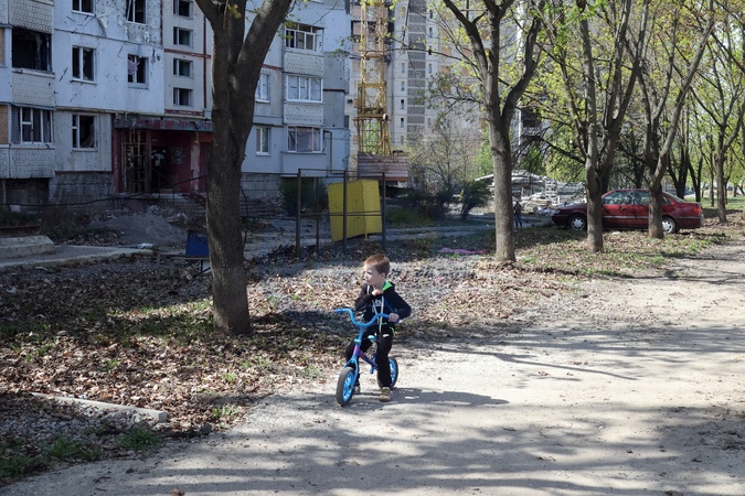 KHARKIV, UKRAINE - APRIL 13, 2024 - A little boy rides a bicycle past a block of flats damaged in Russian shelling, Kharkiv, northeastern Ukraine., Credit:Vyacheslav Madiyevskyy / Avalon
