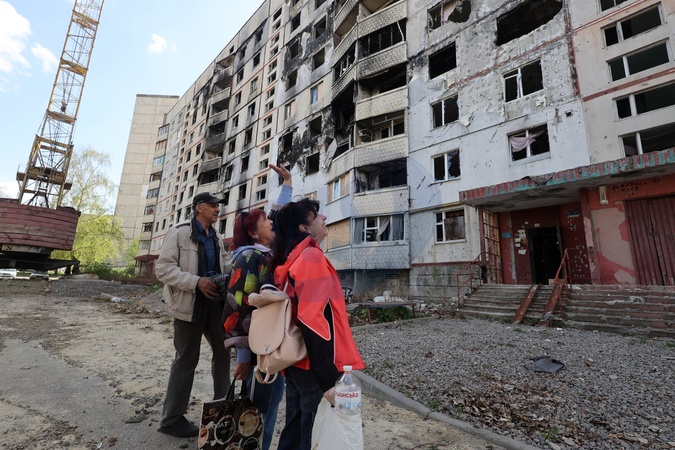 KHARKIV, UKRAINE - APRIL 13, 2024 - People look at a block of flats damaged in Russian shelling, Kharkiv, northeastern Ukraine., Credit:Vyacheslav Madiyevskyy / Avalon